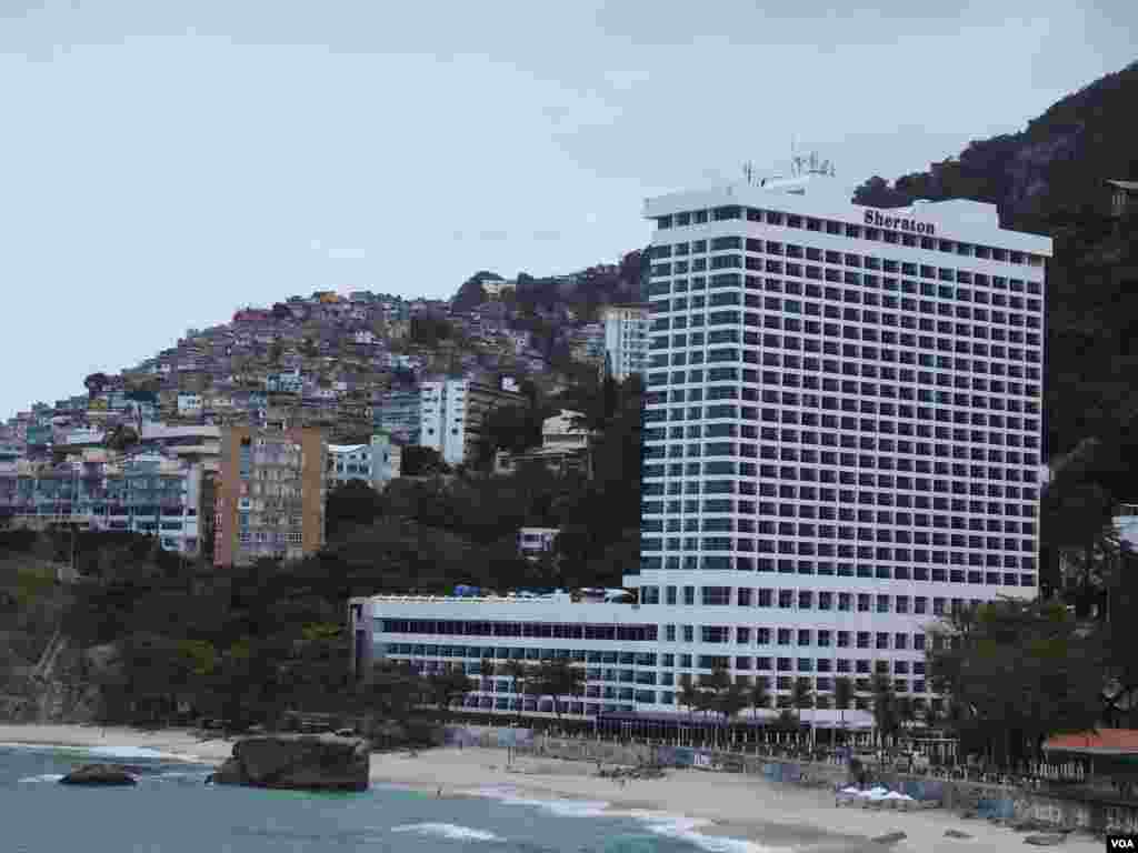 هتل مجلل شرایتون و پشت آن منطقه ای زاغه نشین در شهر ریو.