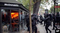 صدها نفر از آنارشیست هایی که سر و صورت های خود را پوشانده بودند، تظاهرات «روز کارگر» در پاریس را روز سه شنبه به نفع خود مصادره کرده و شیشه های فروشگاه ها را شکستند، خودروها را آتش زدند و به سمت پلیس ضدشورش سنگ پرتاب کردند.