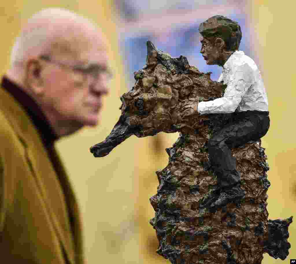 نمایشگاه هنر آلمان در شهر کلن در حال برگزاری است. این مرد مقابل مجسمه ای ایستاده که «مرد سوار بر اسب ماهی» نام دارد.
