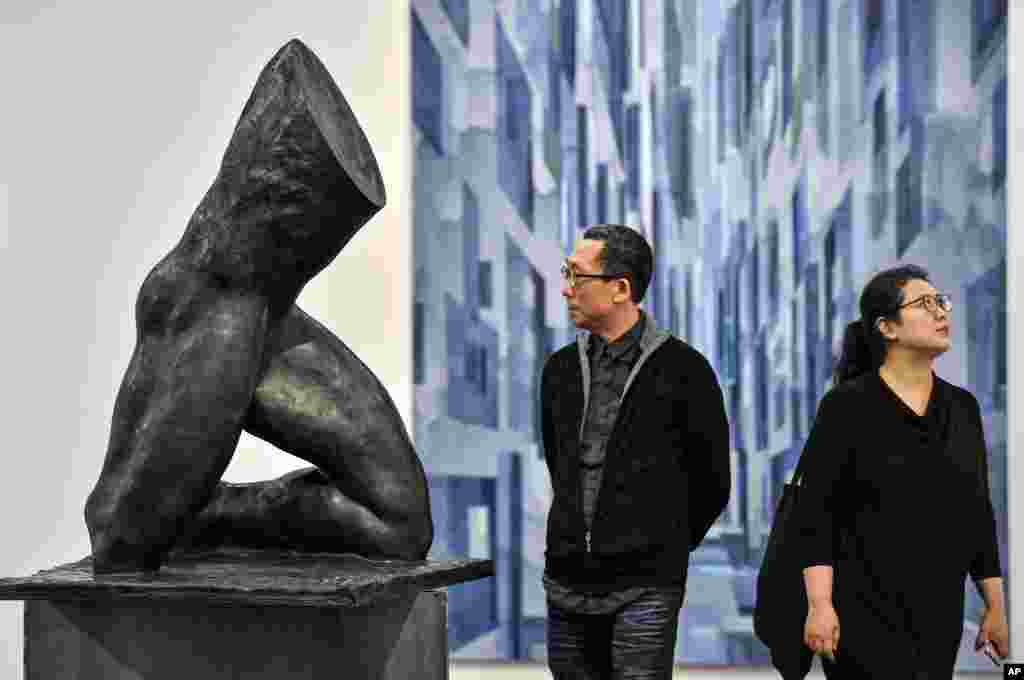 بازدید کنندگان در کنار مجسمه ای از استلا هامبرگ در حاشیه نمایشگاه هنر آلمان در شهر کلن.