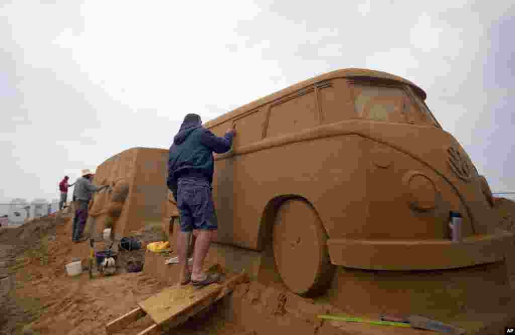 جشنواره مجسمههای شنی در بلژیک. این هنرمند یک فولکس واگن با شن ساخته است.