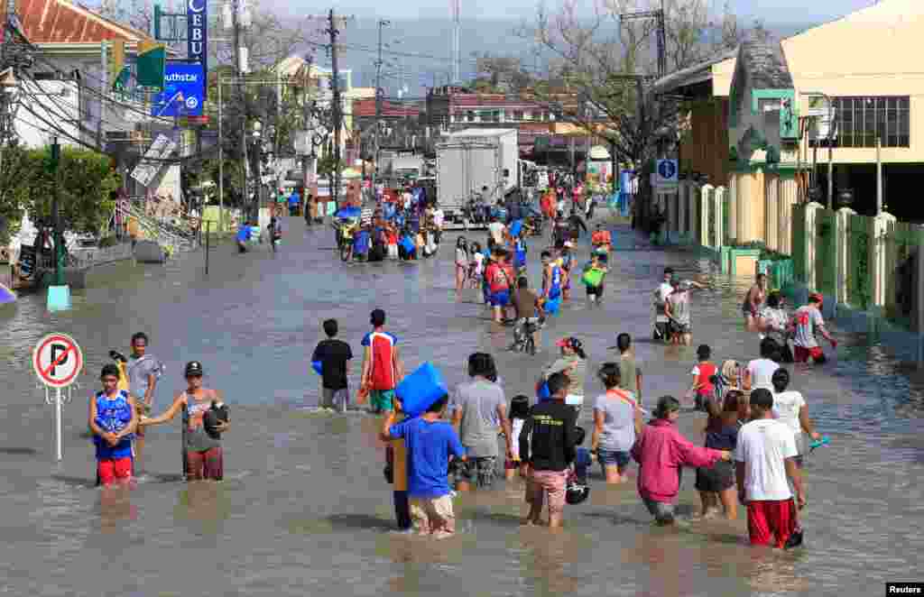 ساکنان شهر نابوا فیلیپین در آبهای سیل راه میروند. این سیل نتیجه توفان "ناک تن" است.